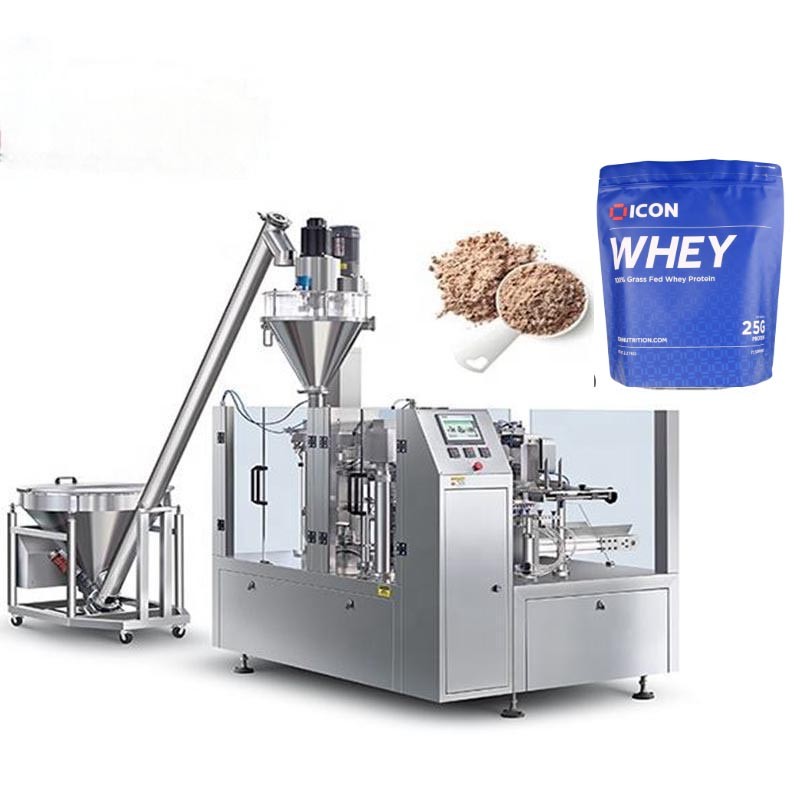 The premium packaging solution for the Sports Nutrition Market. This heavy-duty Rotary Machine fills large Stand-up Zipper Pouches (up to 2kg) with Protein Powder or Meal Replacements. It keeps the zipper area clean and ensures a hermetic seal.