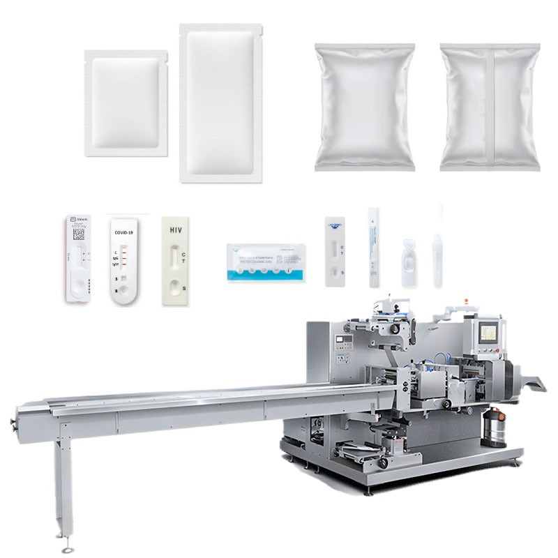 The complete line for Diagnostic Kits. This machine wraps Test Cassettes (e.g., Pregnancy, Influenza, HIV) into moisture-proof Aluminum Foil Pouches. It features an automatic Desiccant Sachet Dispenser to ensure long-term stability of the reagent.