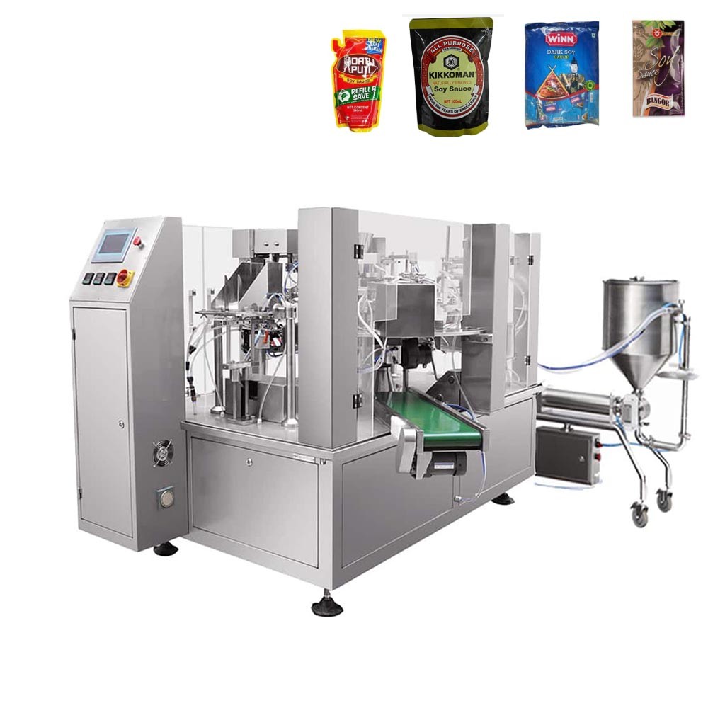 The eco-friendly alternative to plastic bottles. This Rotary Machine fills Large Spout Pouches with Cooking Oil, Soy Sauce, and Vinegar
