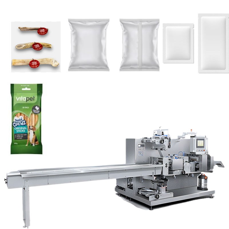 The gentle solution for Long & Irregular Pet Treats. This Horizontal Flow Wrapper packs Dental Chews, Jerky Strips, and Rawhide Bones flat, preventing breakage and bag punctures. Compatible with automatic feeders for high-speed single or multi-piece packing.