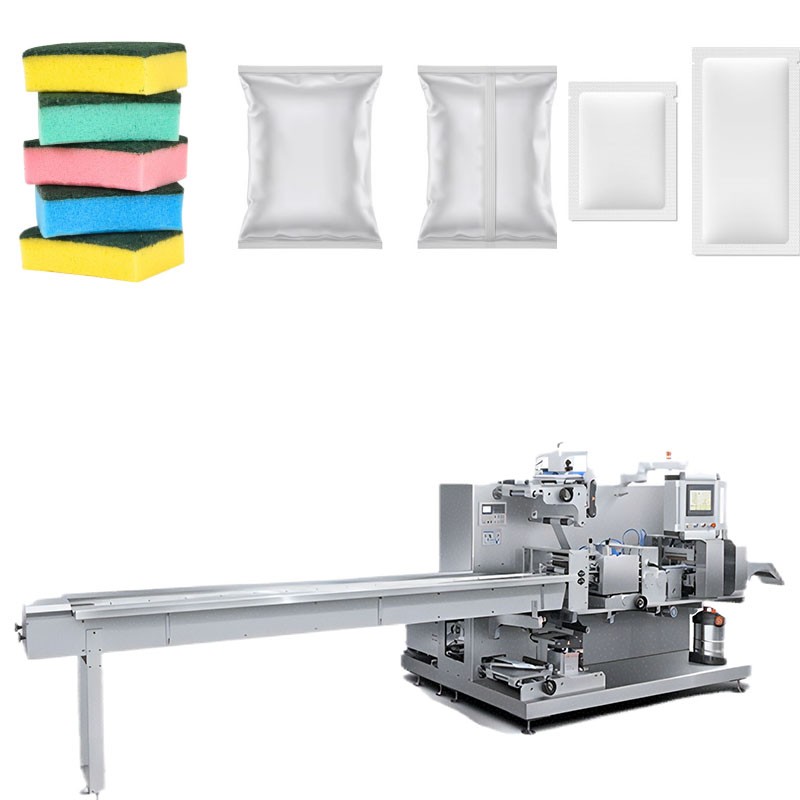 Save on shipping costs with our Compression Flow Wrapper. Designed for Sponges, Scouring Pads, and Cleaning Cloths, this machine uses mechanical rollers to compress products flat before sealing, maximizing carton capacity.